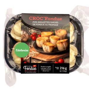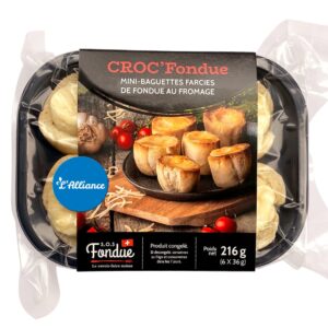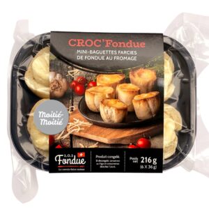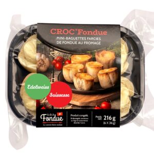 La présentation des Croc’Fondue est simple et rapide : retirez l’emballage plastique et cuire la barquette au four (ou au BBQ) pendant 15 minutes à 375 °F (température interne minimale de 85 °C). Grillez sous l’élément du haut 2 minutes supplémentaires.
